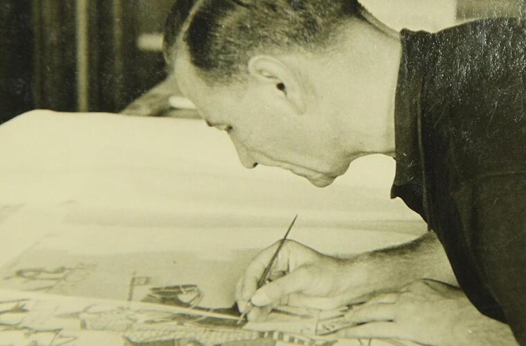 In seiner freien Zeit füllte der Künstler ein Skizzenbuch mit Ansichten von Bayeux und der Abbaye Mondaye, wo der Teppich während des Krieges zeitweise gelagert war. Das Tagebuch ist voller Wasserfarbbilder und zeigt viele Fabeltiere, mit denen der Rand des Teppichs bestickt ist.
