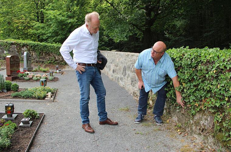 Bei einem Ortstermin erläuterte er Bürgermeister Helmut Blank, was im nächsten Schritt zu tun ist. Teile der historischen Friedhofsmauer sind von Efeu umrankt. Das sieht schön aus und sei auch gut für die Natur, erklärt Schebler. Bloß für die alte Mauer sei der Bewuchs alles andere als geeignet. "Die Wurzeln bohren sich komplett durch die Mauer hindurch." Dort, wo das passiert, wird die Mauer auf Dauer instabil. Deshalb soll das Efeu im Herbst auch entfernt werden, kündigt Schebler an. Erst danach wird erkennbar, ob weitere Schäden vorhanden sind. Schebler rechnet damit, dass in den nächsten zehn Jahren immer wieder Ausbesserungsarbeiten anstehen.