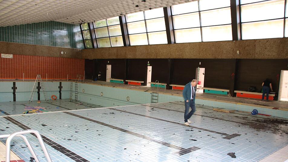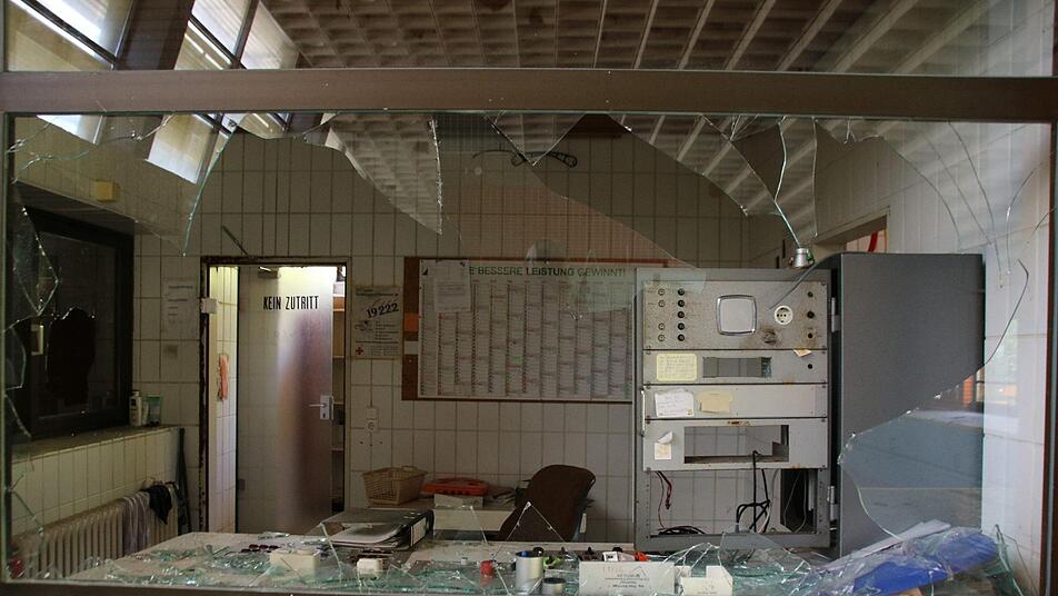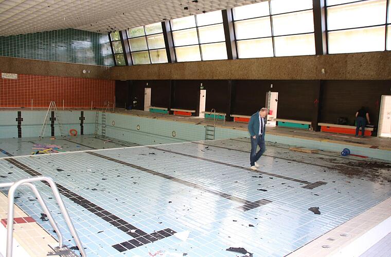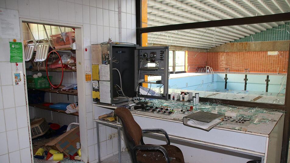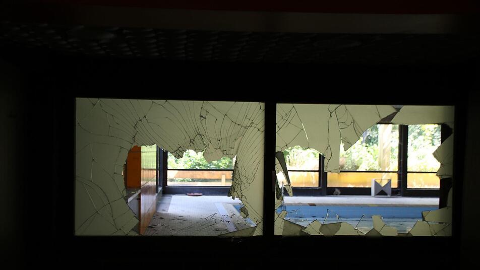 Es knirscht schrecklich unter den Füßen. Erst wenige Tage zuvor sind Vandalen in das seit acht Jahren geschlossene Hallenbad eingedrungen und haben unter anderem fast alle Glastüren zerschmettert. Zwischen den Türrahmen sind nur noch Scherbenhaufen geblieben. Die Täter sind bekannt. Auch an anderen Stellen zeigt sich, dass das Hallenbad gelegentlich einmal ungebetene Gäste hatte.