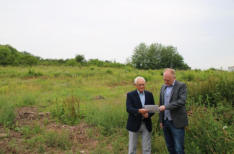 Die Vermarktung des Grundstücks ist wegen der Hanglage schwierig, da sind sich Günter Köth und Bürgermeister Helmut Blank einig. Weil es der Firma Münnerstädter Maschinenbau angeboten werden sollte, rodeten Mitarbeiter der Stadt das Gelände im Winter, um eine Nutzung noch in diesem Jahr zu ermöglichen Allerdings hat sich dieses Vorhaben zerschlagen. Rund 300 000 Euro netto hätte die Beseitigung des Erdaushubs gekostet, hat Helmut Blank ermitteln lassen. Eine Begradigung sei also völlig unwirtschaftlich.