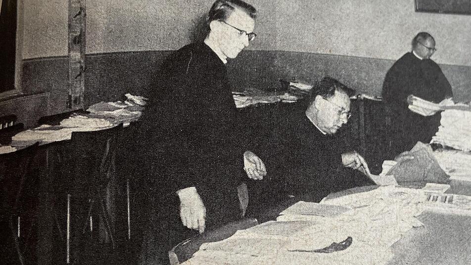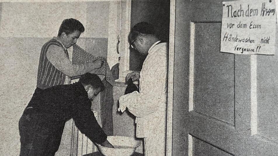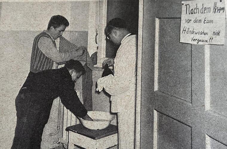 Hygiene war im Kampf gegen die Krankheit - wie auch bei Corona - ein wichtiges Pfrund. Das zeigen alte Fotos, die beispielsweise die Patres Manfred, Thomas und Aquilin beim Sortieren von desinfizierter Wäsche zeigen.