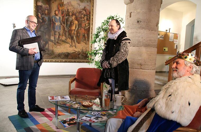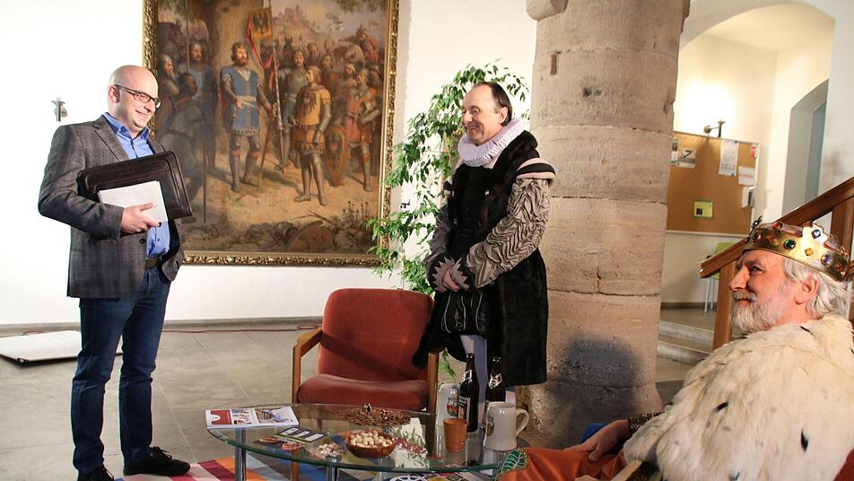 Das Foyer im Erdgeschoss des Rathauses ist hell erleuchtet. "Klappe", "Action" - Graf Berthold VII von Henneberg (Christoph Ackermann) und Kaiser Ludwig, der Bayer (Gisbert Heck) sitzen an einem Tisch und spielen um die Stadtrechte für Münnerstadt. Ausgerechnet jetzt kommt Bürgermeister Michael Kastl die Treppe hinunter, läuft in die Szene hinein. Doch das erwartete "Cut" bleibt aus. Das ist gewollt so. Nicht im Drehbuch stand allerdings, dass Lydia Bangert vom Bürgerservice das Großraumbüro abschließt, um das Rathaus zu verlassen. Das gefällt Rüdiger Wolf richtig gut, das will er so haben. Also muss sie zurück, die Szene wird noch einmal gedreht. Der Bürgermeister freut sich, dass er den Kaiser und den Grafen trifft, da kann er ihnen die Einladung zur 1250-Jahrfeier gleich persönlich überreichen und Porto sparen. Die Szene ist im Kasten.