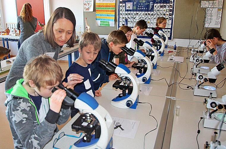 Zuvor wurden sie jedoch in Gruppen, Eltern und Schüler getrennt, durch die Schule geführt. In einem der Klassenzimmer betonte Schwigon, dass alle mit Beamern und Dokumentenkameras ausgerüstet sind, seit wenigen Tagen ist in der ganzen Schule auch WLAN (drahtloses Netzwerk für Computer) verfügbar. In einem mit zahlreichen Geräten gut bestückten Physikraum versicherte ein Physiklehrer den Eltern "wir sind zwar ein sprachliches Gymnasium, aber bei uns kommen auch die Naturwissenschaften nicht zu kurz". Ähnlich äußerte sich eine Biologielehrerin in einem Biologiesaal. Dort schaute gerade eine große Gruppe von Viertklässlern sehr interessiert und angestrengt durch Mikroskope. "Die sehen stark vergrößerte Fliegenbeine", erklärte die Lehrerin den Eltern.