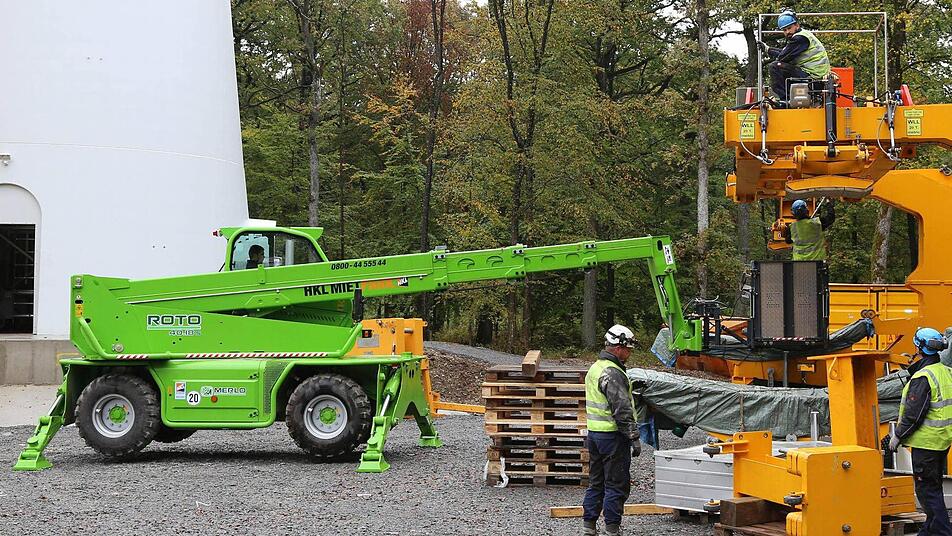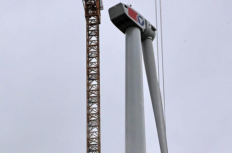Zum großen Bedauern der Zuschauer konnten am Samstag an der Windkraftanlage fünf im Wald am "Langen Schiff" die beiden fehlenden Flügel noch nicht montiert werden. Der erste war bereits am Freitag hochgezogen worden und hängt nun senkrecht nach unten. Die beiden anderen werden aus technischen Gründen nun doch erst am Montag angebracht - vorausgesetzt, der Wind weht nicht zu stark. Doch immerhin gab es bei der Informationsveranstaltung, zu der die "Langes Schiff Energie GmbH" eingeladen hatte, jede Menge technische Informationen über die Anlage.