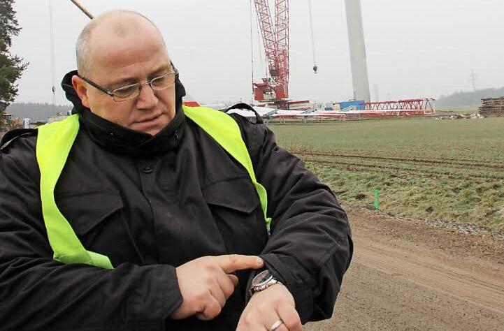 Ingo Behrendt schaut auf seine Armbanduhr. "Gleich geht´s los", kündigt der Sicherheitsmann auf der Baustelle des neuen Windparks zwischen Burghausen und Windheim an.