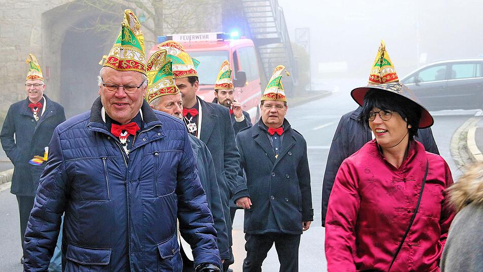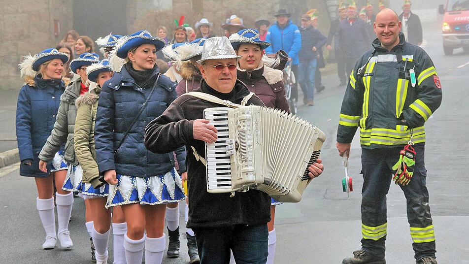 Begonnen hatte der Faschings-Fez auf dem Parkplatz am Oberen Tor mit dem schon zur lieben Gewohnheit gewordenen Umzug. Der obere Teil des Tors war aber wegen des herrschenden Nebels kaum auszumachen und ungemütlich kalt war es auch noch. All das konnte aber zahlreiche Erwachsene und Kinder, den Kolping-Elferrat und die Elferrats-Garde in kurzen Röckchen nicht davon abhalten, sich dort zu treffen und mit Akkordeonspieler Michael Lukaszczyk (städtische Jugendmusikschule) an der Spitze durch die Stadt bis zum Anger zu ziehen. Der entlockte seinem Musikinstrument bekannte Gassenhauer wie "Rucki zucki" oder "ja mir san mim Radl da" und sorgte damit auch bei den Zuschauern am Straßenrand für Karnevals-Stimmung. Einige schunkelten sogar spontan und vergaßen auch Helau-Rufe nicht. "Fast wie in Köln ist es hier" meinte augenzwinkernd ein junges Paar am Straßenrand beim Schunkeln. Natürlich gingen auch viele Fenster auf, denn die Menschen wollten schließlich wissen, was da unten auf der Straße los ist. Und immer wieder tönte es "Mürscht Helau" oder "Kaufhaus Mürscht Helau." Mitglieder der Freiwilligen Feuerwehr regelten derweil den Verkehr.