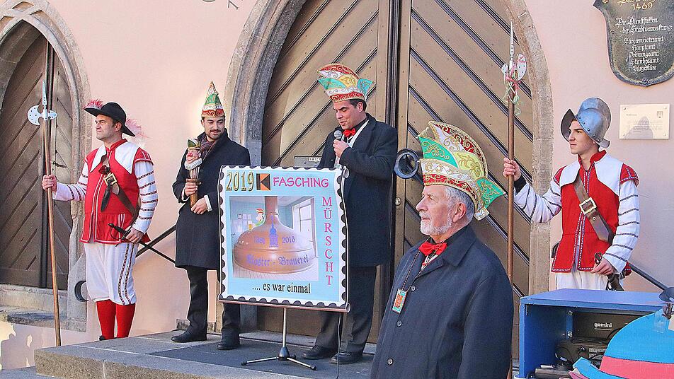 Er kündigte auch gleich an: "Helau, der Mürschter Nagel ist schon gespannt, was die neue Session so alles kann. Es ist viel passiert in unserer Stadt, bestimmt nicht alles er gesehen hat." Das Motto lautet dieses Jahr "es war einmal" - in Erinnerung an die im Jahr 2016 nach über 600 Jahren geschlossene Kloster-Brauerei.