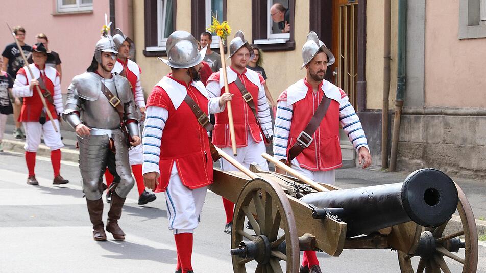 Begonnen hatte das Heimatspiel mit dem Festumzug vom Oberen Tor. Die Zuschauer nutzten die Gelegenheit, die Schauspieler von etwas geringerer Entfernung, als dies bei der eigentlichen Aufführung möglich wäre, zu sehen und ihnen zuzujubeln.