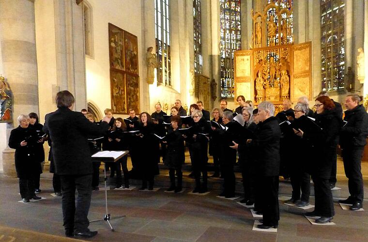 Spätromantische Wucht entfalteten das Ensemble in der dramatischen Ausarbeitung von Christian Finks "Fürwahr, er trug unsere Krankheit" durch eine sehr differenzierte Dynamik, während in dem aus dem 20. Jahrhundert stammenden, doch eigentlich auch spätromantischen "Ave Maria" des Franzosen Henri Carol, in dem klar gestaltete Konsonanten die sorgfältige Vorbereitung des Chores bis zum wunderschön gesungenen "Amen" verdeutlichten.