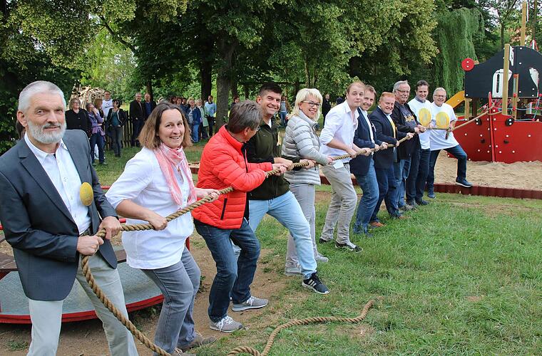 Im Hintergrund kreischten fröhlich Buben und Mädchen und turnten auf den neuen Spielgeräten des Spielplatzes bei der Festhalle herum oder schossen schon mal im Vorgriff auf das Schicksalsspiel gegen Schweden auf dem danebenliegenden Fußballplatz Tor um Tor für Deutschland. Und im Vordergrund wurden Reden gehalten und spielte der Musikverein