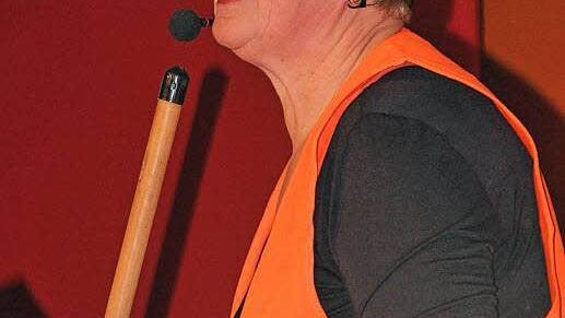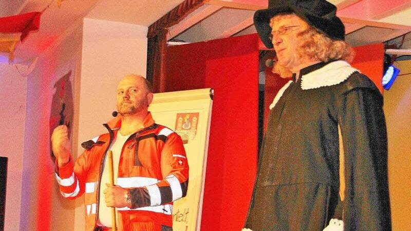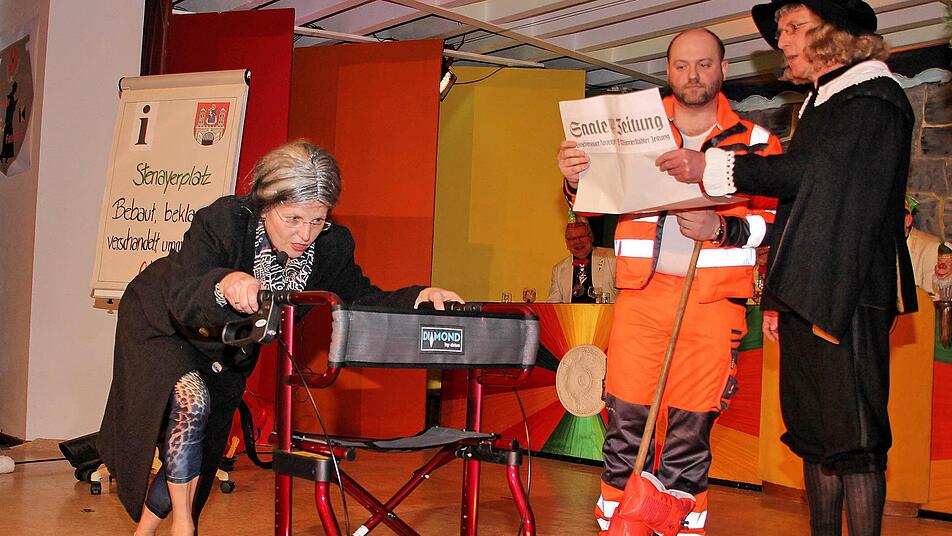 Es geht auch umgekehrt. "Bin dann mal wieder da", verkündeten Pater Felix Meckl und Norbert Düring. Der Stadtpfarrer im Straßenkehrer-Look und der Mesners als Mann aus dem 17. Jahrhundert stimmten in das Lied "Lebt denn der alte Dag Schröder noch? - Er lebt noch, er plant noch, er kassiert noch!" ein. Rosina Eckert präsentierte sich als "die perfekte Frau", als "Miss Kultourismus", ohne die in Mürscht "nix mehr" geht: "Ich seh sexy aus und drum kommt es nicht von ungefähr, dass ich zuständig bin für den Fremdenverkehr." Die "perfekte Frau" kündigte auch an "beim nächsten Mal stelle ich mich als Bürgermeisterin zur Wahl. Ich bin ganz sicher, dass ich gewinn, denn für Wahlkampf hab ich den 6. Sinn."