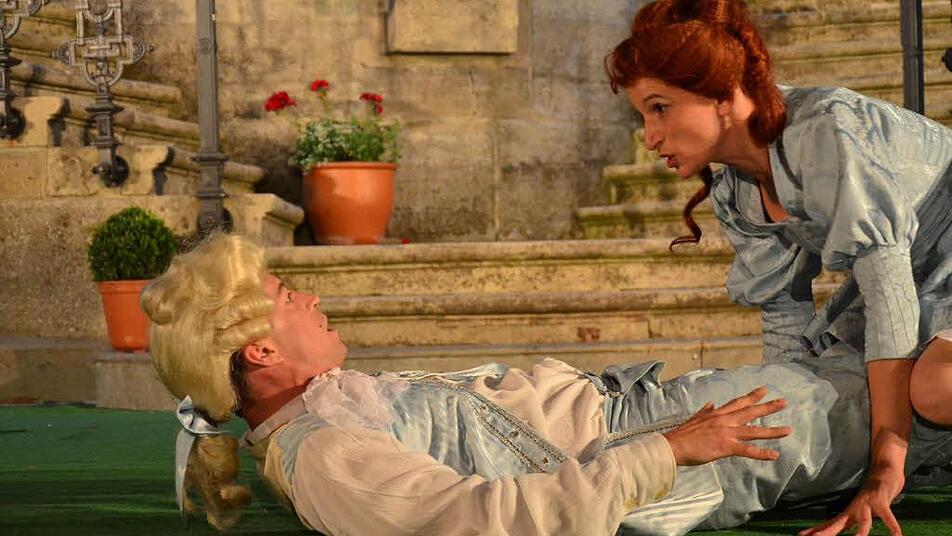 Erfolgsrezept der Autoren. "Großartig, wie gekonnt sich die Schauspieler duellierten und gar im Quartett aufeinander einhieben", meinte Besucher Reinhold Schädlich aus Münnerstadt. Theaterleiterin Anne Maar, neuen Ideen und Experimenten durchaus zugetan, weiß aber auch, mit welchen Pfunden sie mit dem Schlossambiente als Kulisse wuchern kann. Niemand also erlag der Versuchung, das Stück in die heutige Zeit zu transportieren. Und so spielte die romantisch-rasante Komödie wie im 18. Jahrhundert nicht nur auf der Bühne. Das Schloss selbst, die Treppen, Balkone und die Wege im Park, waren Spielstätte. Besucherin Brigitte Wolf aus Bad Kissingen meinte: "Das Stück passt einmalig zum Ambiente."