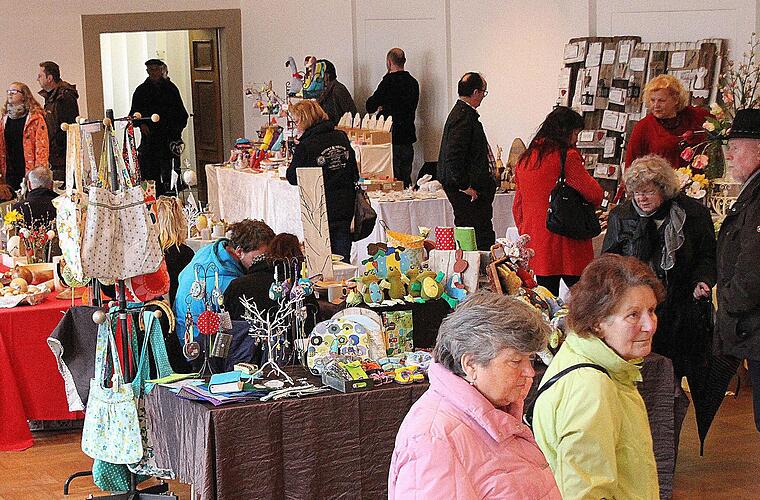 Viele Besucher in der Alten Aula Ein ganz anderes Bild in der Alten Aula, wo am Mittag regelrechtes Gedränge herrschte. Eine Künstlerin aus Kitzingen, die seit zehn Jahren hierherkommt und ihre Glaskunst präsentiert, ist sehr zufrieden, denn "es hat sich noch immer gelohnt". Gleich nebenan zeigt Margarethe Bömmel aus Nüdlingen ihre "Hasenschule" aus Stoff und Filz, die vor allem bei Kindern beliebt ist. Wahre Kunstwerke sind die künstlerisch gestalteten Eier, die der Dittelbrunner Leopold Marschner geschaffen hat. "16 Arbeitsgänge vom Anbohren und Ausblasen bis zum Vergolden waren nötig", erzählt er.