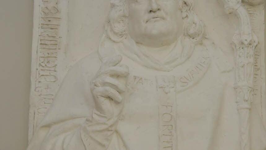 Ab jetzt istdie restaurierte Grabplatte des Bischofs Friedrich Philipp von Abert im Kreuzgang des Augustiner-Konvents St. Michael in Münnerstadt zu sehen.