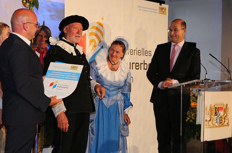 Anschließend ging Daniel Drascek auf die drei Neuaufnahmen ein, Traudi Siferlinger interviewte die jeweiligen Akteure, am Ende überreichte Albert Füracker die Urkunden. Ganz besonders die Münnerstädter nutzten die Gelegenheit, sich als Preisträger ins rechte Licht zu setzen. Sie zeigten Szenen aus dem Heimatspiel und beantworteten Fragen rund um die Geschichte und die Schwedenprozession zu den Stadttoren.