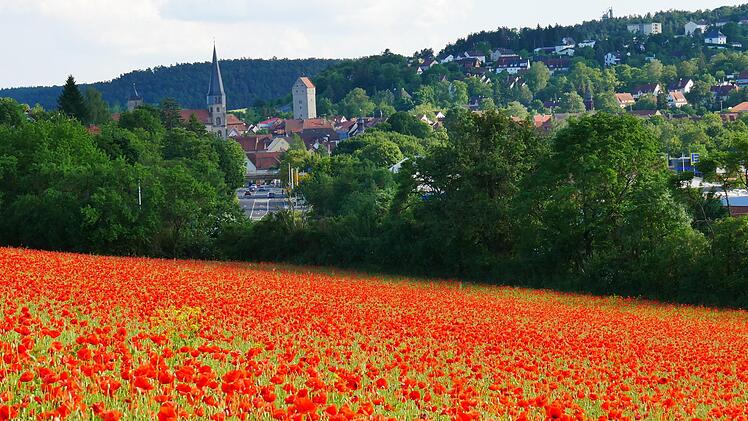 Eine ungewöhnliche Perspektive auf Münnerstadt bietet sich von einem blühenden Mohnfeld oberhalb der Bundesstraße 287. Zu erkennen sind die nördliche Stadteinfahrt, die Türme der Stadtpfarrkirche, des Juliusspitals und der Klosterkirche sowie das Obere Tor.