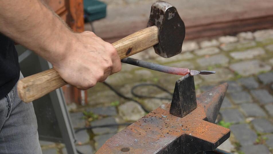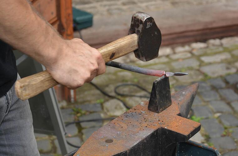Dass man nicht einfach auf die Werkstücke schlagen kann "wie ein Schmied" zeigte sich gleich zu Beginn. Mit viel Gefühl, aber auch der entsprechenden Kraft muss der heiße Stahl geformt werden. Dabei sieht man an der Farbe, ob er bereits die richtige Bearbeitungstemperatur hat, erklärte der Schmied den Interessierten.