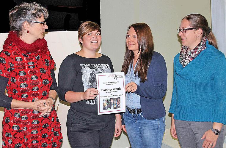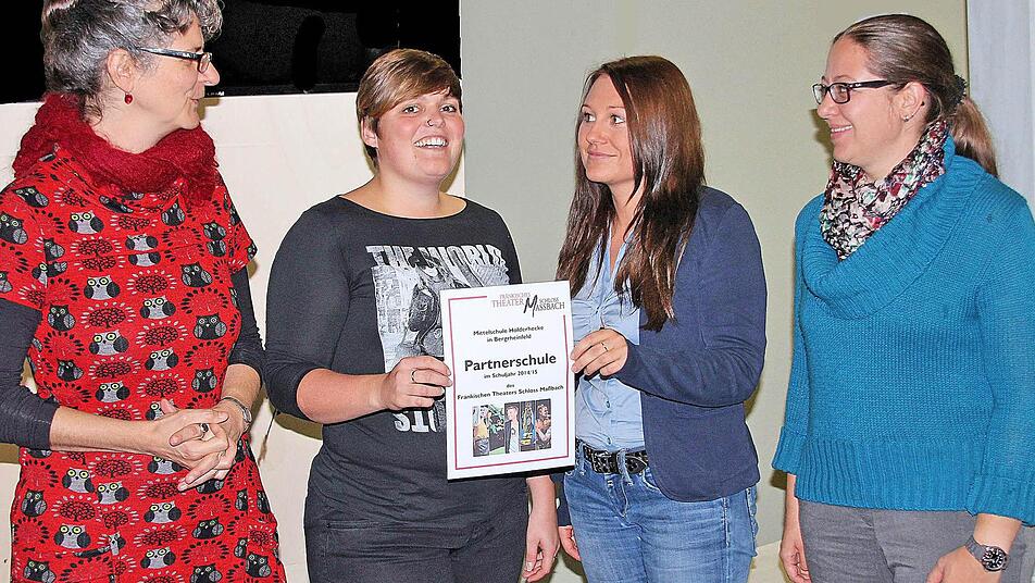 Bisher gute Erfahrungen Die Schule ist 2014/ 2015 Partnerschule des Fränkischen Theaters Schloss Maßbach. Im Rahmen dieser Kooperation sind zahlreiche Aktionen geplant, vom Probenbesuch bis zur Vor- und Nachbereitung der Stücke. Im Rahmen einer Pressekonferenz im Theater in Maßbach erläuterten Theaterleiterin Anne Maar, Theaterpädagogin Karolin Wunderlich sowie die beiden Lehrerinnen Nina Blank und Sabine Steinbrenner aus Bergrheinfeld die Ziele der Kooperation und tauschten eine Partnerschaftsurkunde aus.