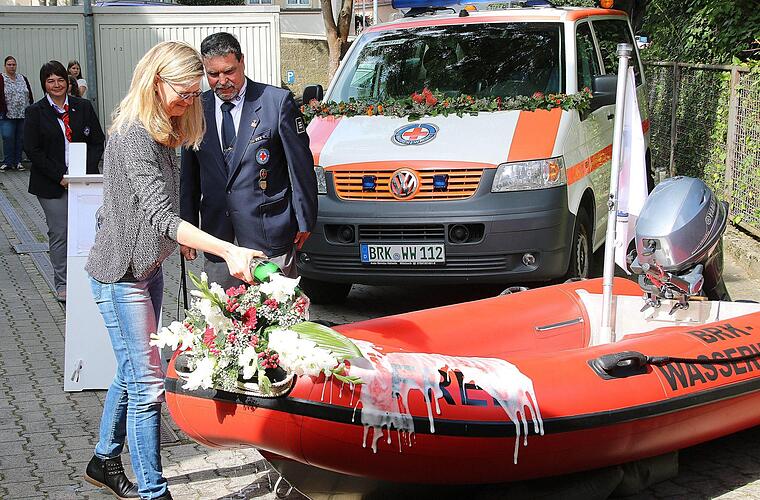 Pater Markus Reis segnete das Boot und den Kleinbus. Beide seien wichtig für die Gesellschaft und für die Mitmenschen. Anschließend wurde das Boot von Karin Mayer und Stefan Kuhn mit Sekt auf den Namen "Fred" getauft. Der vor einigen Jahren gestorbene Namensgeber Alfred Hekele hat die Ortsgruppe aufgebaut und war lange Jahre auch ihr Vorsitzender.