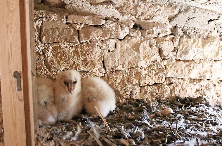 Früher hätten verwilderte Tauben dieses versteckte Nest genutzt. Das hat dem Vereinsvorsitzenden des Vereins nicht so gut gefallen. Seitdem aber auch ein Turmfalke sein Nest am Torturm hat, sind die Tauben weg. Den Platz hat nun die Schleiereulen-Familie eingenommen. Dass die seltenen Tiere sich hier eingerichtet haben, macht Graeber schon ein bisschen stolz.