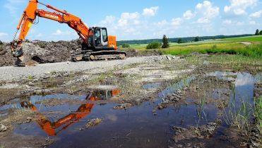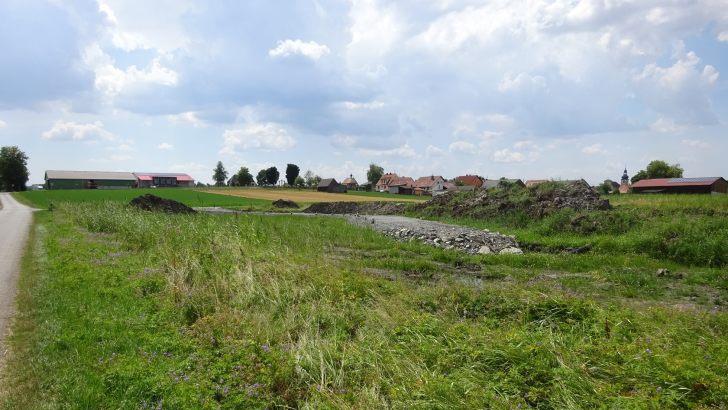 Um die Wasserfläche überhaupt herstellen zu können, musste ein Schotterweg gebaut werden. Als dieser fertig war, kam der Brief vom Landratsamt, dass nicht weiter gebaut werden dürfe. Matthias Kirchner ist froh, dass der Bau des Wasserbeckens derzeit ohnehin ruht, weil der Zubringerweg auf moorigem Untergrund liegt und sich erst setzen muss, ehe er befahren werden kann.