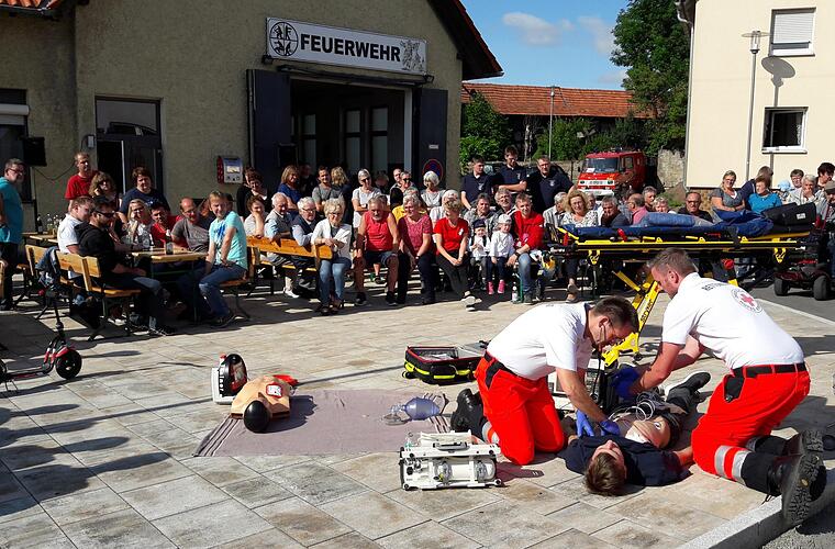 Mit diesem Wissen wurde nun die Anwendung des Defibrillators während einer Ernstfallübung, die von Wolfgang Klöffel kommentiert wurde, demonstriert: Ein Spaziergänger (Thomas Herttrich) kollabierte und wurde von zwei Ersthelfern (Ferdinand und Leopold Gehrig) versorgt, wobei beide Ersthelfer im Verlauf der Übung die Reanimation nach den Anweisungen des AED fortsetzten, bis nach knapp 10 Minuten das BRK mit einem Rettungswagen kam und die medizinische Betreuung übernahm.