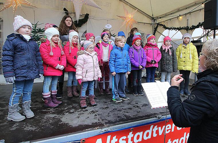 Die Kameras vieler stolzer Omas und Opas, Mütter und Väter klickten, als der Kinderchor der Liedertafel unter der Leitung von Annemarie Kreuzer drei Weihnachtslieder sang. Die Chorleiterin vergaß dabei nicht, etwas Werbung für das Kindermusical zu machen, das am zweiten Adventssonntag in der Alten Aula aufgeführt wird.