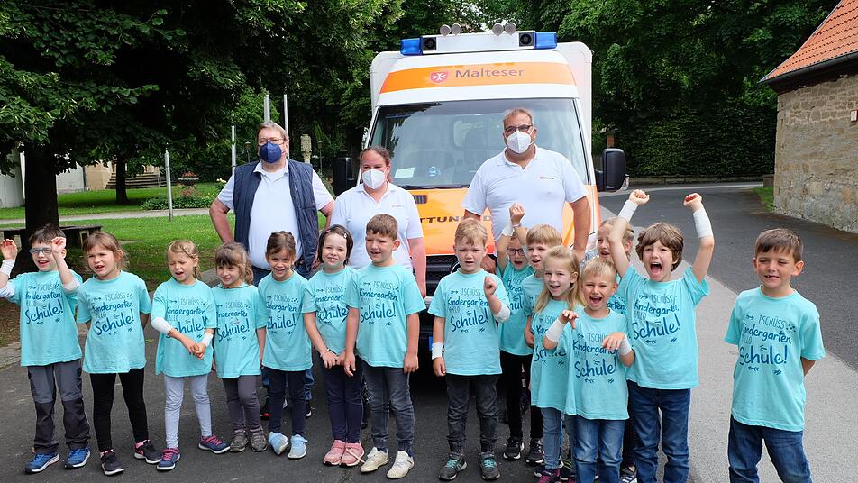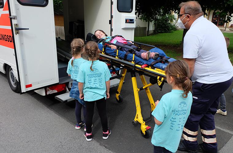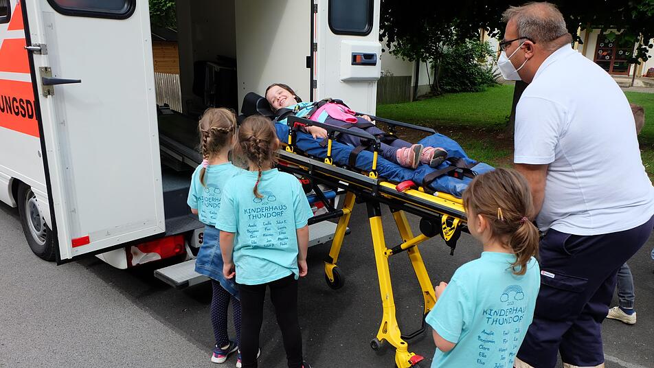 Die Vorschulkinder des Kinderhauses "Unterm Regenbogen" in Thundorf hatten Besuch vom Malteser Hilfsdienst. Sie lernten den Rettungswagen mit Ausstattung kennen und Erste- Hilfe-Maßnahmen.