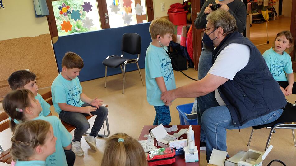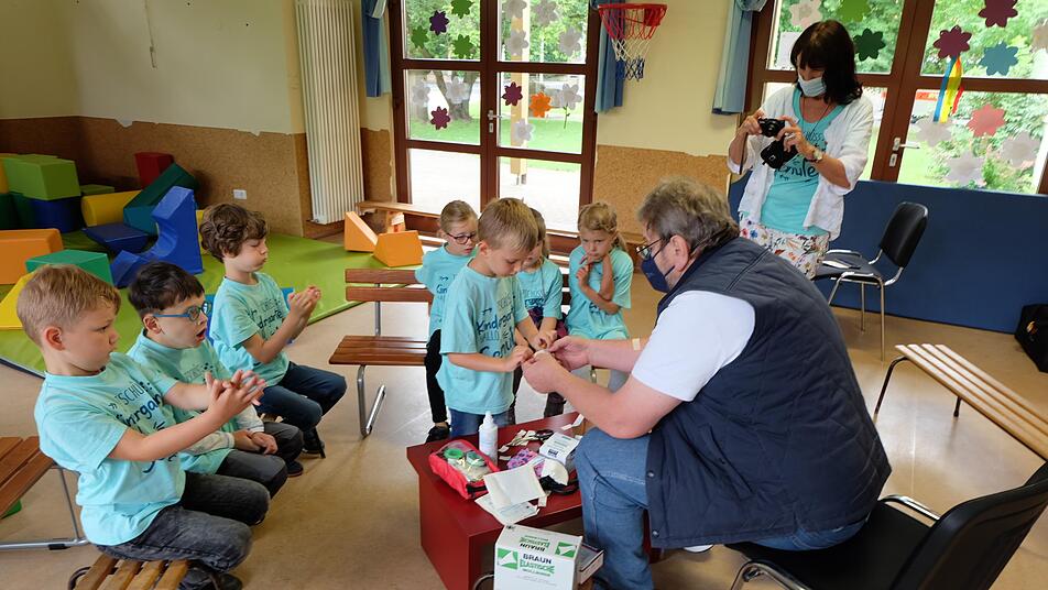 Einen Einführungskurs in Erste Hilfe vermittelte der Malteser Hilfsdienst, Ortsverband Thundorf, den Kindern im Kinderhaus "Unterm Regenbogen". Martin Heusinger, Eva Weigand und Ewald Gessner hatten die 15 Vorschulkinder aufgeteilt und demonstrierten die Ausstattung und den Transport im Rettungswagen - diesen Part übernahmen Heusinger und Weigand . Die andere Hälfte wurde im Turnraum durch Ewald Gessner konfrontiert mit den Erste Hilfe-Maßnahmen, wie Anlegen eines Verbandes, Pflaster aufkleben, Blutdruck messen und das Herz abhören.