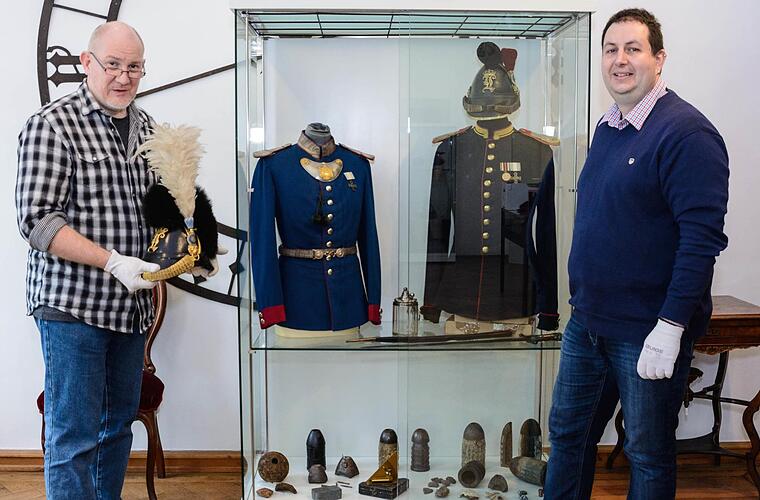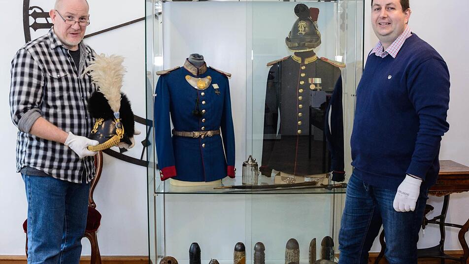 Die Ausstellung in Münnerstadt zu kuratieren war für Neugebauer selbstverständlich: "Zum einen war ich hier Klosterschüler und habe schon allein deshalb eine ganz besondere Verbindung zur Stadt. Zum anderen haben Björn Hein und ich bereits beim Tag des Offenen Denkmals und anderen Veranstaltungen eng zusammengearbeitet und lagen dabei immer auf einer Wellenlänge". Seit mittlerweile drei Wochen baut man auf, sie wird zudem durch zahlreiche alte Stiche und Informationen über die Einigungskriege bereichert. "Mir ist außerdem wichtig, dass im Henneberg-Museum Ausstellungen gezeigt werden, die so nirgendwo anders zu sehen sind. Auch wenn das sehr viel Mühe macht - es ist die Anstrengung wert", sagt Museumsleiter Björn Hein. Auch bei der Ausstellung sind Objekte zu sehen, die einzigartig sind. Beispielsweise ein 160 Jahre alter Straußenfederbusch, der einst den Helm eines Offiziers der Chevaulegers zierte oder der Rock eines Generalleutnants der Art, wie ihn General Zoller im Krieg von 1866 trug . "Wichtig war uns, dass nur Originale zu sehen sind", so Neugebauer.