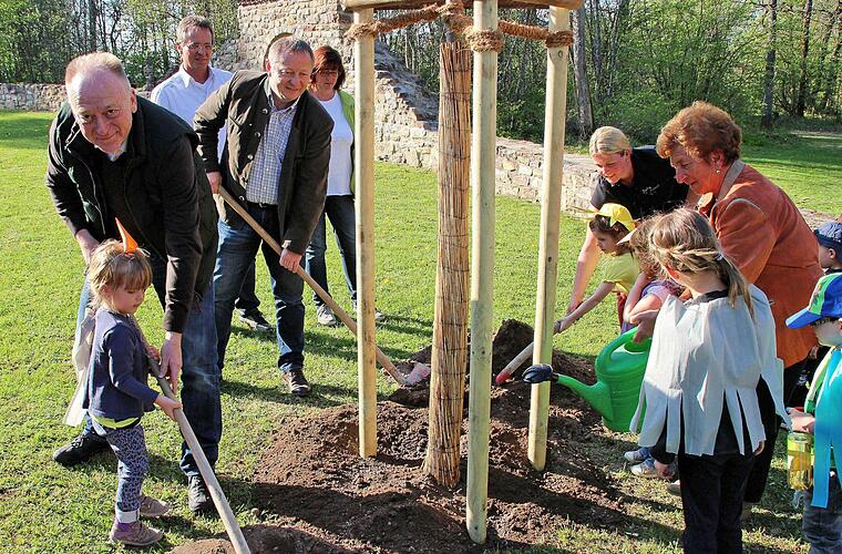 Zum "Tag des Baumes" hat der Landkreis zwei Walnuss-Bäume für den Platz neben der Kirchenruine auf dem Michelsberg gespendet. Die Reichenbacher Kindergarten-Kinder halfen beim Pflanzen kräftig mit.