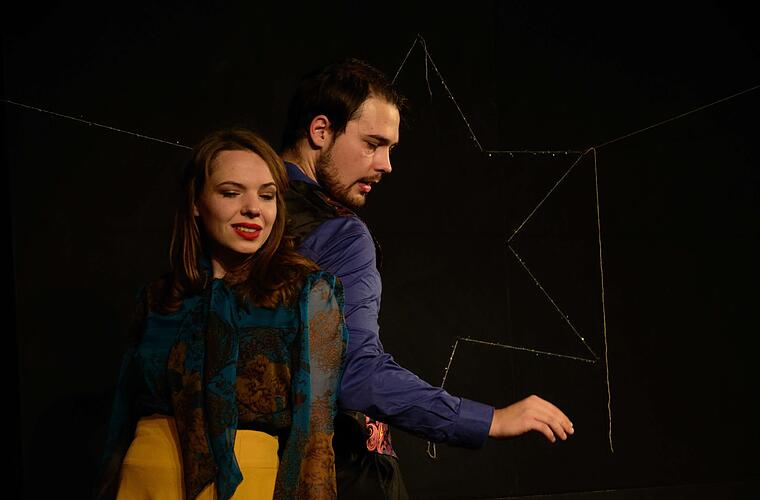 Und da ist dann noch die Lautsprecherstimme von Susanne Pfeiffer. Unsichtbar, aber eindringlich präsent, entwirrt sie den Handlungsstrang und hält doch den letzten Faden zum heiter-traurigen, höchst überraschenden Ende in der Hand, den das sich gefunden habende junge Paar - ideenreicher Regie-Schlussakkord - mit dünnem Seil als Stern und Blume wirkungsvoll an die Wand des Bühnenbildes dekoriert.