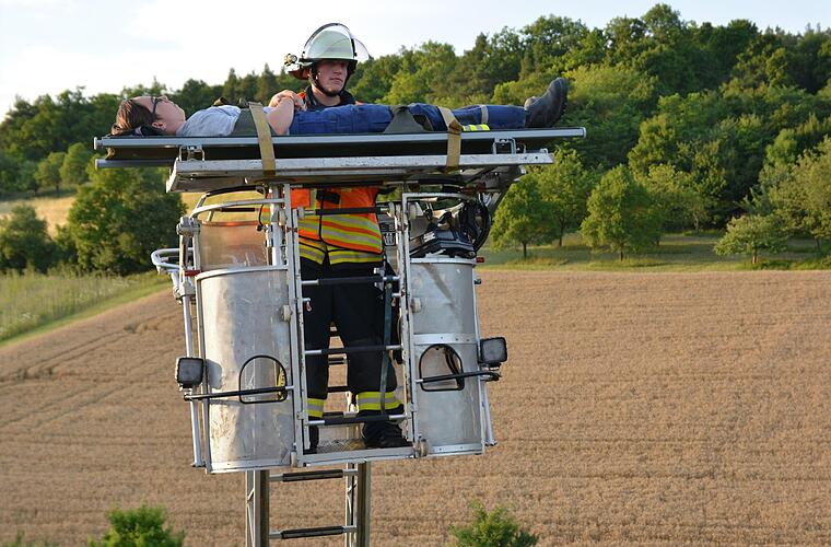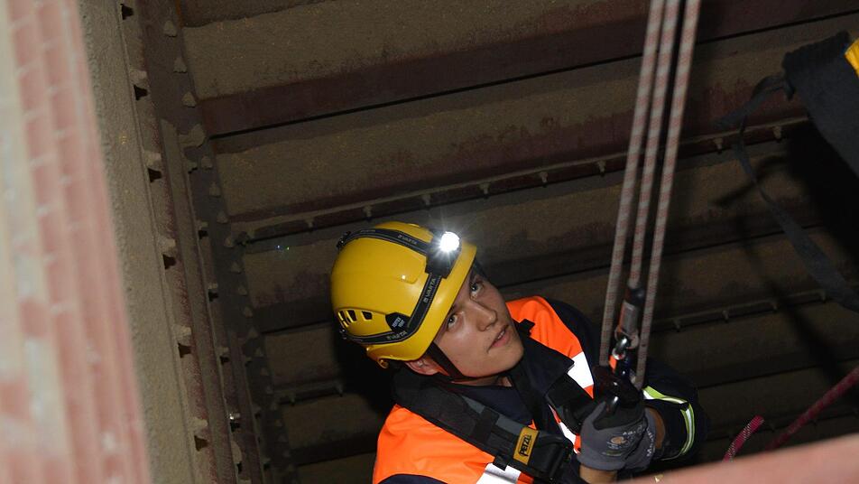 Insgesamt ist das Silo vom Keller aus 27 Meter hoch, die Drehleiter der Münnerstädter Feuerwehr muss voll ausgefahren werden, damit der "Verletzte" aus dem Gefahrenbereich gebracht werden kann. Die Person, die in Wahrheit nur ein Dummy ist und am unteren Ende des Silos liegt, muss jedoch ebenfalls geborgen werden. Dazu heißt es, 18 Meter in die Tiefe zu steigen, um ihn zu erreichen. Routiniert wird eine Absturzsicherung aufgebaut und ein Feuerwehrmann nach unten abgeseilt, von wo aus er die Lage überprüft. Kurz darauf kann der Dummy gerettet werden. Währenddessen übernimmt draußen die Feuerwehr Brünn neben der Verkehrsabsicherung auch die Verletztenbetreuung.