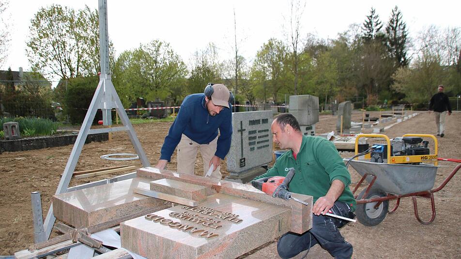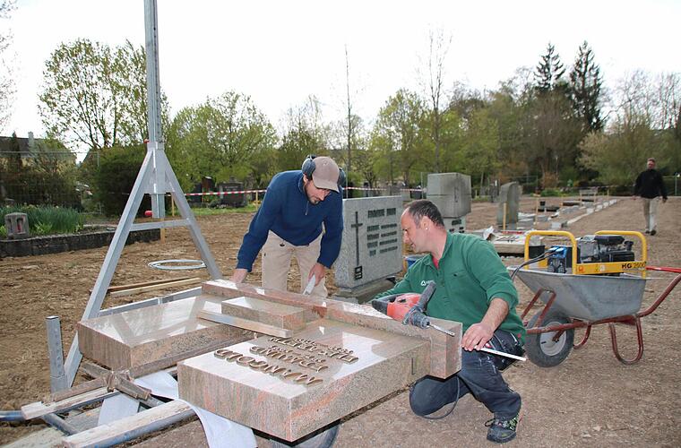 Ein Grund dafür sei, so der Münnerstädter Steinmetz Alexander Kessler, dass aus optischen Gründen die durchlaufenden Fundamentstreifen, auf denen die Grabmale befestigt werden, tiefer verlegt werden Das Tieferlegen ist zeitaufwendiger, da für jeden einzelnen Grabstein auf das Fundament noch zusätzlich ein Sockel gegossen werden muss, erläutert Kessler die laufenden Arbeiten.