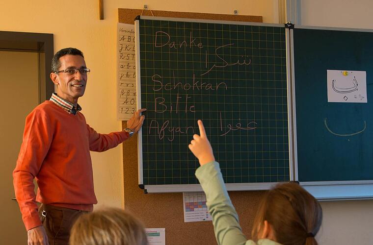 Austauschlehrer Hany Agaiby gibt Kindern in der Grundschule Poppenlauer einen spannenden Einblick in die arabische Sprache und Kultur.
