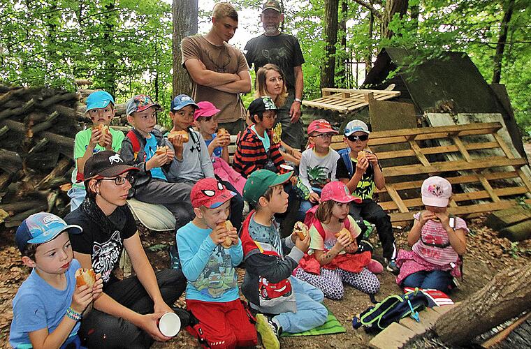 Ein zweieinhalbstündiger Waldspaziergang macht richtig hungrig und durstig. Kein Wunder also, dass die Buben und Mädchen, die dieses Jahr von der Maßbacher evangelischen Kindertagesstätte in die Grundschule wechseln, wenige Minuten nach den Hornsignalen "Sammeln der Jäger" und "zum Essen" aus der Tiefe des Waldes bei der Jagdhütte von Jagdpächter Bernd Newiger am Rande des Reitbergs auftauchten und auf ihre Bratwürste warteten.