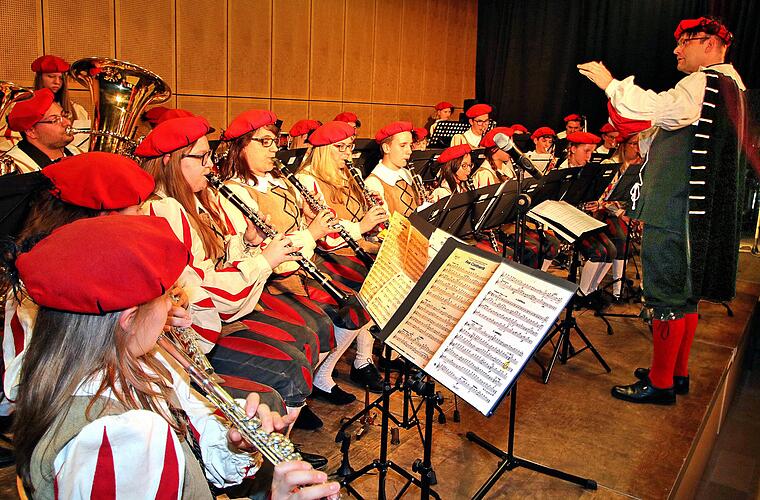 Die stolzen Eltern, Großeltern, Geschwister, Onkel und Tanten und natürlich auch Musikliebhaber ohne familiären Bezug spendeten schon den ersten Beifall, als die Mitglieder des Jugendblasorchesters in ihren schmucken Uniformen einmarschierten, die sie erstmals in der breiten Öffentlichkeit präsentierten. Sie erinnerten mit ihren Barretten, rot-weißen Leinenkitteln, Lederwamsen und -hosen sowie weißen Kniestrümpfen an Landsknechte aus dem Mittelalter. Nur die Teilnehmer am Neujahrsempfang der Stadt im Januar hatten die jungen Musiker schon einmal so erleben dürfen.