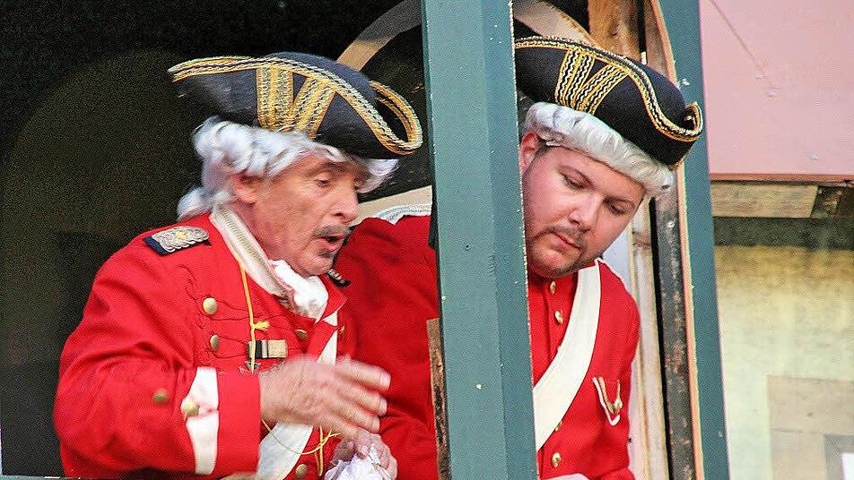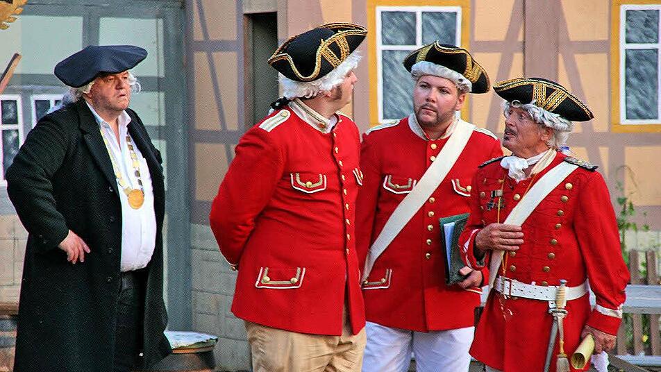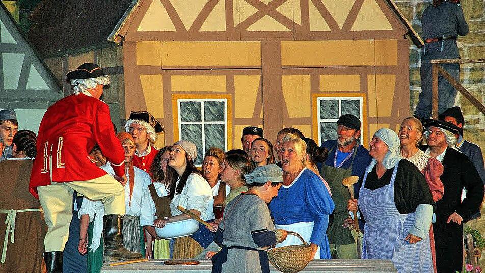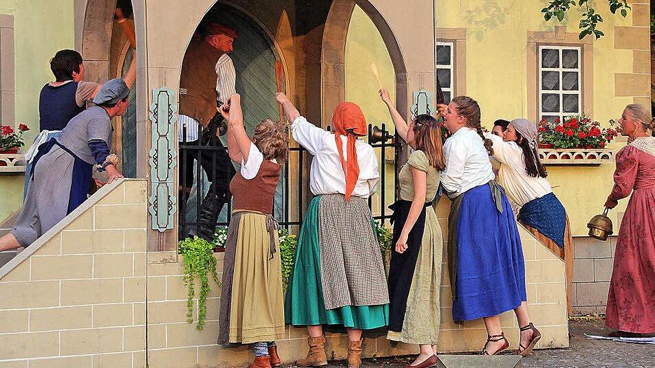 Mal wurde ein Nachttopf aus einem Fenster gekippt, mal flogen die Federn beim Rupfen von Hühnern auf offener Bühne - Tierschützer können ganz ruhig bleiben, die Hühner waren ja aus Plastik. Und was die Schauspieler von sich gaben, sorgte auch fast ununterbrochen für Heiterkeit: "Ihr Mannsbilder sei so dumm wie Bohnenstroh", oder "Euer Gnaden wollen die Bürgerschaft bewaffnen? - Nein, die Säue und Hühner!"