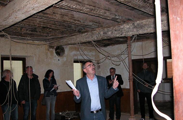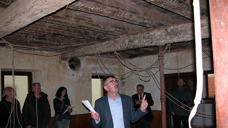 Dem Museumsgasthaus "Zum Stern" sieht man von Außen nicht an was der Leitungswasserschaden im Innern angerichtet hat. Bürgermeister Harald Hofmann lud die Gemeinderäte vor der jüngsten Sitzung zu einer Ortsbesichtigung ein, um die Situation nach dem eingetretenen Wasserschaden vor Ort zu begutachten. Der beauftragte Architekt Andreas Halboth (Münnerstadt) erläuterte die notwendigen Schritte hinsichtlich einer Denkmal verträglichen Sanierung und erläuterte den Aufbau der Decke.