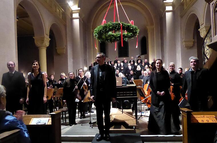 Johann Sebastian Bachs Weihnachtsoratorium ist für viele Menschen in der Vorweihnachtszeit eine wichtige und willkommene Einstimmung auf das Fest. So war es erfreulich, dass Kantor KMD Jörg Wöltche nach 31 Jahren ohne dieses Hauptwerk des evangelischen Weihnachtsfestes mal wieder zur Aufführung der ersten drei Kantaten in die Erlöserkirche in Bad Kissingen einlud. Der heftige Schneefall in Bad Kissingen steuerte weihnachtliche Stimmung bei, doch haben sich die Aufführungsbedingungen an der Kirche seit 1986 fast umgekehrt. Damals hatte Kantor Lochner noch einen Kirchenchor, mit dem er das Werk über einen langen Zeitraum einstudieren konnte; einen solche gibt es an der Erlöserkirche seit vielen Jahren nicht mehr. Dafür kann er heute auf ein Kammerorchester zurückgreifen, mit dem er schon sehr viele Konzerte veranstaltet hat und das es von Kirchenkantaten gewohnt ist, mit Bläsern von außerhalb und Gesangssolisten zusammenzuarbeiten. Um einen Chor aus dem Nichts zu zaubern, rief Wöltche Chorsänger, die das Werk schon anderweitig gesungen hatten, auf, sich zu einem Projektchor für das Weihnachtsoratorium zusammenzuschließen. Auch das ist in der Vorweihnachtszeit nicht so ganz einfach, denn an vielen Kirchen sind die Sänger durch Proben und Aufführungen an ihren eigenen Ort gebunden. Wie Wöltche in seiner kleinen Begrüßung sagte, war auch die winterliche Pracht für einige weitere allzu hinderlich, so dass letztendlich 31 Sängerinnen und Sänger (darunter drei Kissinger) das kleine Podest in der Kirche füllten.