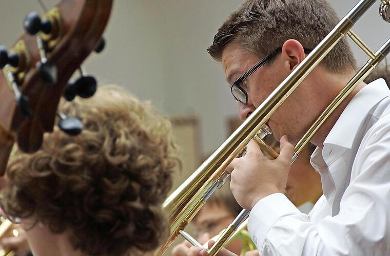 griff. "Da habe ich gewusst, dass alles in Ordnung ist", sagt die Kursleiterin. Sie organisierte am nächsten Tag ein Konzert im Krankenhaus, nachdem sie erfahren hatte, dass das schon lange ein Wunsch von Rainer Voisard, dem Chefarzt der Inneren Medizin, war. Wenzel musizierte mit Schiene und Verband auch gleich wieder mit. Mit der linken Hand hebt er die Posaune nur an, erklärt er.