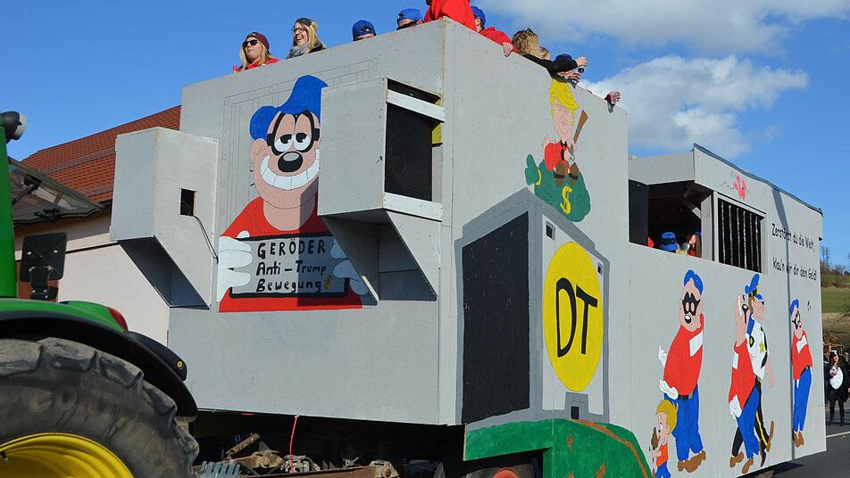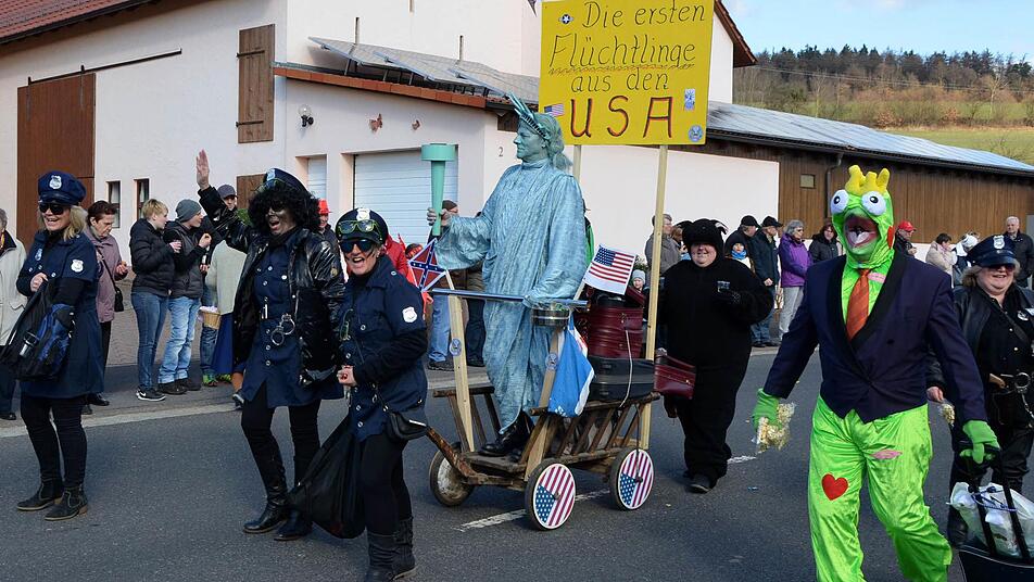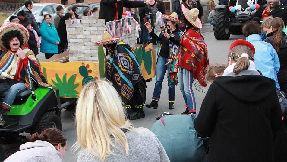 Herrlicher Sonnenschein, fast zehn Festwagen und unzählige Fußgruppen lockten Hunderte von Besuchern zum Faschingszug nach Waldfenster. Großes Thema hier die USA mit ihrem neuen, nicht unumstrittenen Präsidenten Trump. Aber nicht nur er, sondern auch viele, die derzeit Amerika verlassen wollen oder müssen, marschierten im Waldfensterer Zug mit. Angefangen bei Superman, Kermit dem Frosch über Miss Liberty der Freiheitsstaue bis hin zu fast unzähligen Mexikanern, sie alle marschierten hier mit. Natürlich auch mit dabei das Waldfensterer Kamel, denn das gehört in Waldfenster zum festen Bestandteil jeden Faschingszuges und das schon seit Jahrzehnten.
