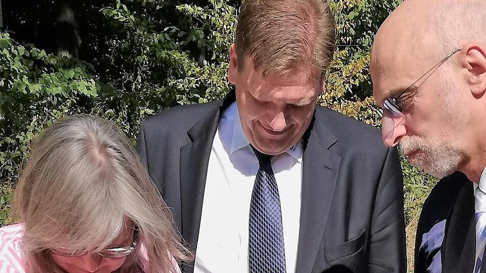 Im Beisein von Oberbürgermeister Kay Blankenburg und Stadträten sowie Vertretern der mit den Tief- und Betonbauarbeiten beauftragten Baufirma Josef Hell (Eltingshausen) und des für Planung und Bauüberwachung verantwortlichen Ingenieurbüros Hahn (Bad Kissingen) erläuterte Bad Kissingens Tiefbauleiter Thomas Hornung Sinn und Zweck der neuen, 950 000 Euro teuren Anlage: Im Normalfall sammeln sich Schmutz- und Regenwasser in der Kanalisation und werden bis zu einer Mischwassermenge von maximal 9,5 Litern pro Sekunde direkt in die Albertshausener Kläranlage eingeleitet. Sobald diese Grenze bei Regen überschritten ist, wird das anfallende Abwasser in einem 230 Kubikmeter fassenden, 130 Meter langen Stauraumkanal mit einem Rohrdurchmesser von 1,60 Metern gesammelt, während ab einer Drosselstation weiterhin nur die Maximalmenge in die Kläranlage abfließt. Sollte sogar dieser Stauraumkanal das aufkommende Schmutz- und Regenwasser nicht mehr aufnehmen können, wird das überschüssige Abwasser in das neue 1850 Kubikmeter fassende Regenrückhaltebecken eingeleitet.