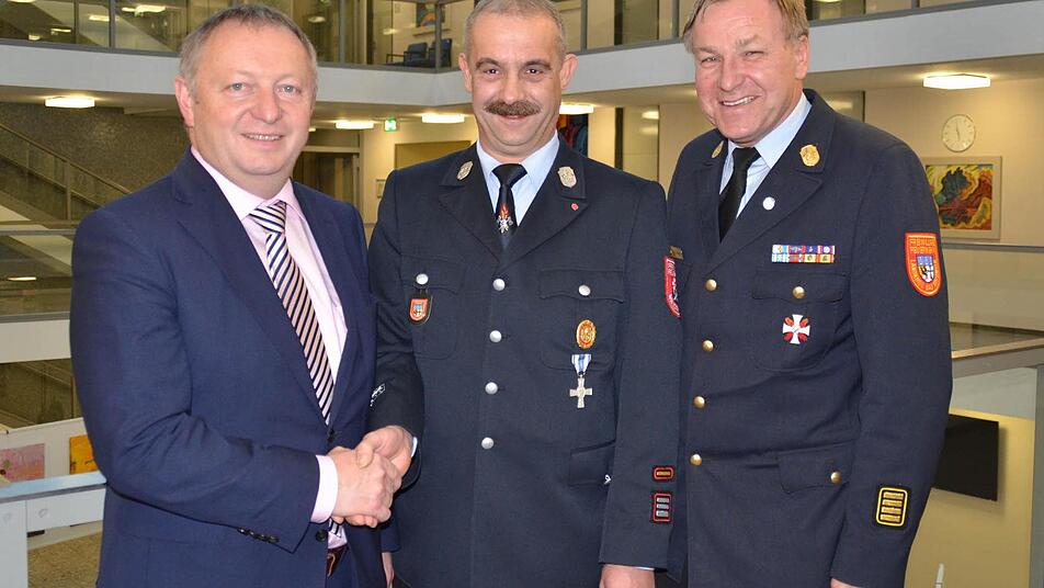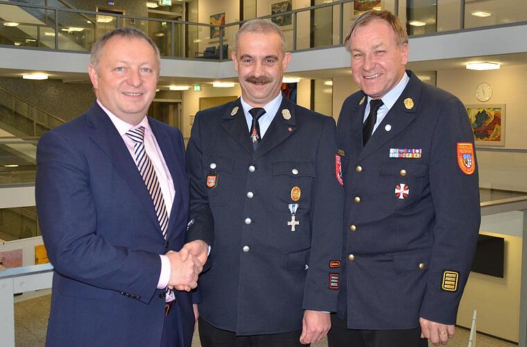 Den Verwaltungsakt zur Ernennung des neuen Kreisbrandmeisters nahmen am Dienstagnachmittag Kreisbrandrat Benno Metz und Landrat Thomas Bold zum Anlass, um sich beim bisherigen Amtsinhaber Egon Gessner für seinen Einsatz zu bedanken. Dieser hatte das Ehrenamt 2007 übernommen, war jedoch vor einigen Monaten krankheitsbedingt ausgefallen.