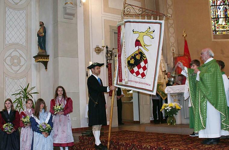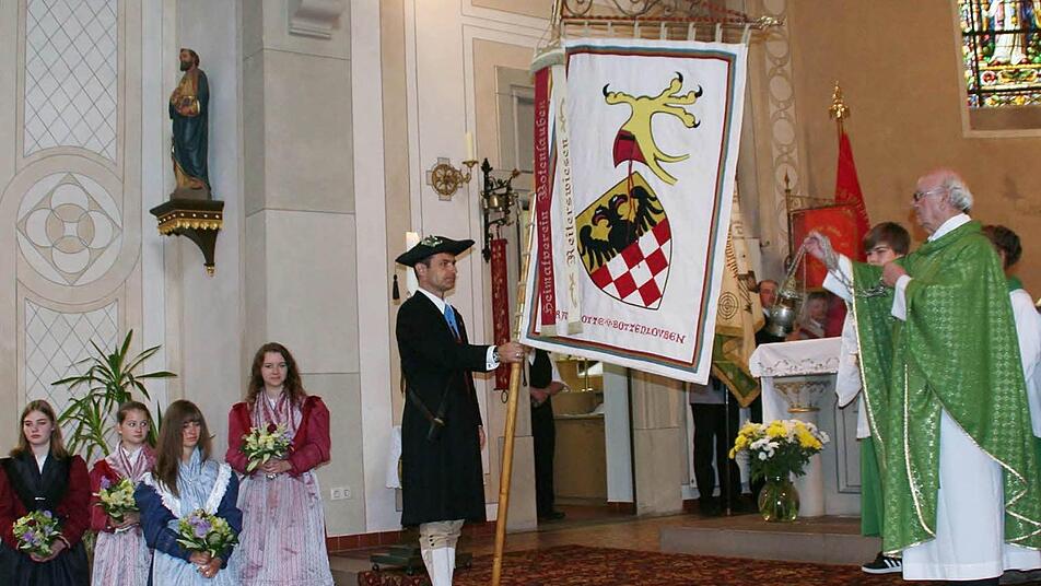 Die neue Fahne des Heimatvereins, begleitet von der Trachtentanzgruppe, führte die Kirchenparade der örtlichen Vereine an, die sich aus Anlass der Fahnenweihe des Botenlaubenvereins zusammengefunden hatte. Pfarrer i. R. Heinrich Mitka gestaltete in der St. Laurentiuskirche einen feierlichen Gottesdienst mit einer sehr persönlichen Predigt und segnete das Wappentuch des Vereins. Die Feuerwehrkapelle Reiterswiesen empfing die festlich gestimmten Besucher im Anschluss daran mit einem Standkonzert am Dorfplatz.
