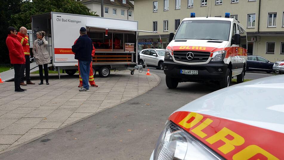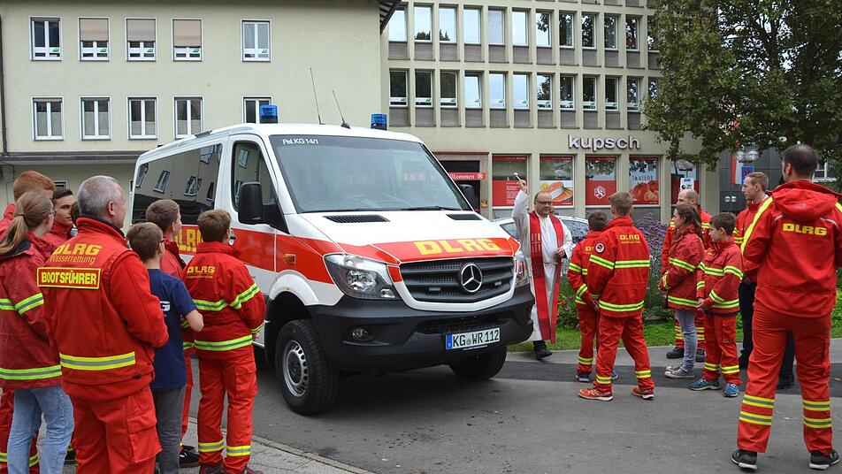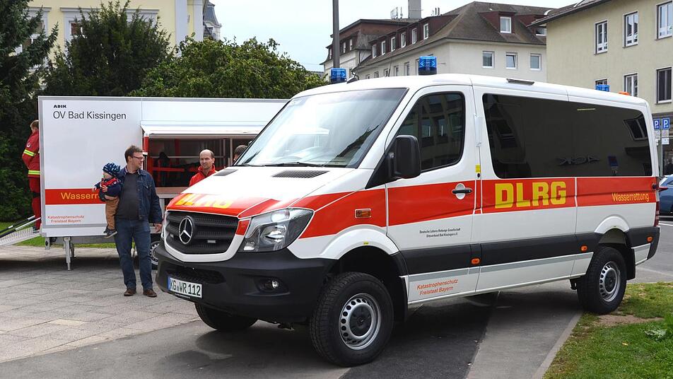 2013 war auch die DLRG-Ortsgruppe (Deutsche Lebensrettungsgesellschaft) Bad Kissingen zum Hochwassereinsatz nach Oberbayern abkommandiert worden. Damals stellte sich heraus, dass die Wasserretter für ihre primäre Aufgabe zwar gut ausgebildt und ausgerüstet waren es fehlte aber an der Logistik. So entschlossen sich DLRG-Landesverband und bayerisches Innenministerium, die 14 zur DLRG gehörenden Wasserrettungszüge jeweils mit einem Zugfahrzeug samt Hänger nachzurüsten. Dieser Fuhrpark wurde Anfang August an die jeweiligen Verbände übergeben. In Bad Kissingen, dessen Schnelleinsatzgruppe ebenfalls verstärkt wurde, wurde nun die kirchliche Segnung der beiden Fahrzeuge vorgenommen. Wie der "Chef" der Kissinger DLRG Gruppe verlauten ließ, habe man sich um die beiden Fahrzeuge beworben und auch den Zuschlag, wie 13 andere bekommen. Damit sind die beiden, zum Wasserrettungszug "Unterfranken II" gehörenden Fahrzeuge, in Bad Kissingen stationiert. Es handelt sich dabei zum einen um einen höhergelegten 180 PS starken Allrad-Mercedes-Sprinter der sowohl zum Personentransport wie auch als Zugfahrzeug für den zweiachsigen Hänger dient. Beide Fahrzeuge haben keine Rettungsgeräte an Bord, sondern dienen rein der Beförderung der Retter und ihrer persönlichen Ausrüstung. So sind auf dem Hänger insgesamt 38 Feldbetten, Wolldecken, Tische und Sitzgelegenheiten für ebenso viele Personen verladen.