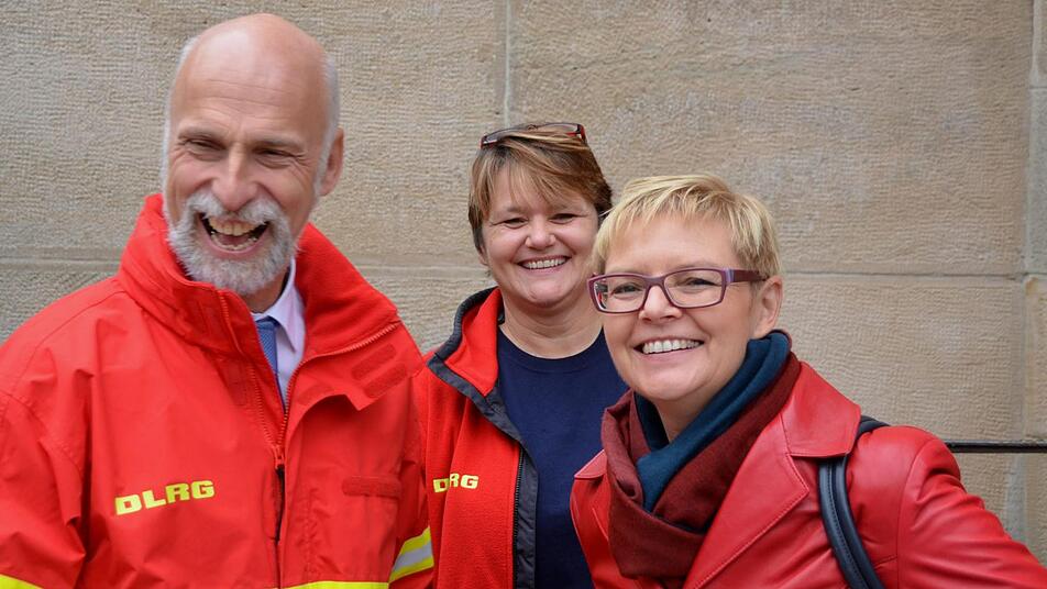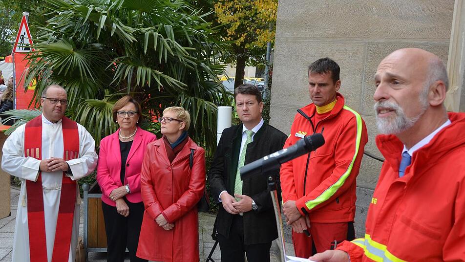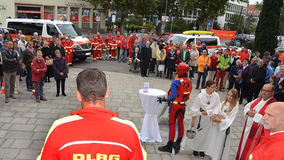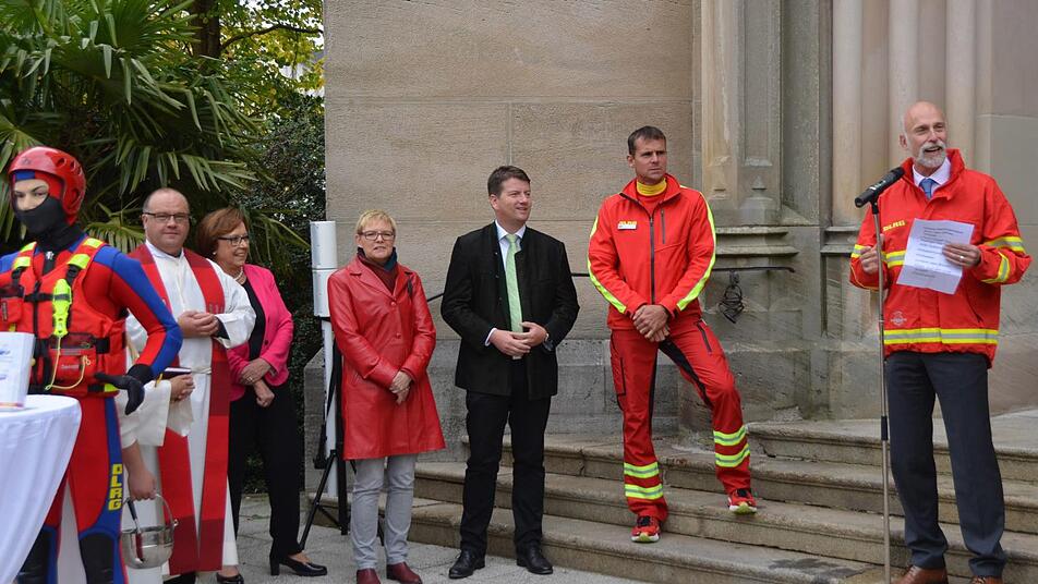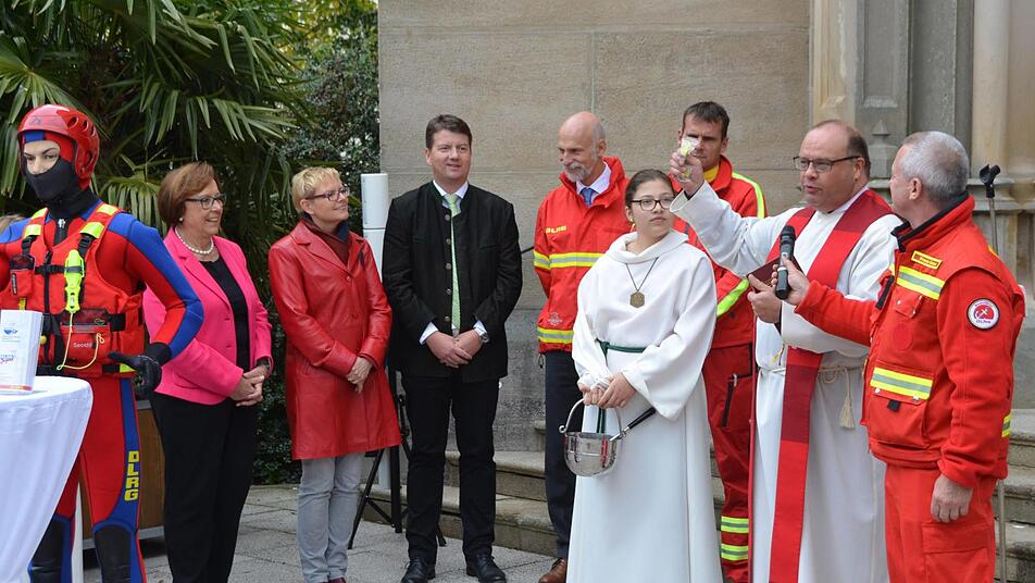 Pfarrer Greier überreichte an den Vorsitzenden drei kleine Schutzengel für die Fahrzeuge "damit Ihr bei jedem Einsatz und bei jeder Übung gut beschützt seid". Für die evangelische Kirchengemeinde, dessen Pfarrerin verhindert war, sprach er ebenfalls die besten Segenswünsche aus, bevor er mit viel Weihwasser die aufgebauten Einsatzgeräte segnete. Oberbürgermeister Kay Blankenburg, der ebenso wie MdB Sabine Dittmar und MdL Sandro Kirchner der Veranstaltung beiwohnten, ging in seinem Grußwort kurz auf die Gründung der Deutschen Lebensrettungsgesellschaft im Jahr 1913 ein und betonte, dass sie auch heute noch ebenso gebraucht werde wie vor über hundert Jahren, als kaum zwei Prozent der Bevölkerung überhaupt schwimmen konnte. Heute seien nur die Aufgaben vielseitiger geworden und selbst die meist besinnlich dahinfließende Saale könne sich schnell in einen reißenden Strom verwandeln.