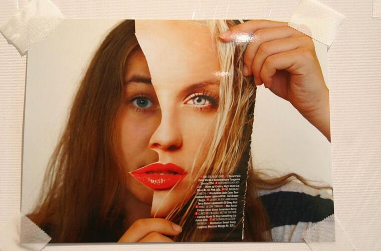 Die ist mit Cellophan bespannt, was die Aussage der Bilder bewusst verstärken soll. "Auch der schöne Schein wirkt durchsichtig, wenn man dahinter schaut" meint Mika Meinck, eine der angehenden Künstlerinnen und deutet auf ihr Portrait, das sie mit einem Zeitungsausschnitt kombiniert hat. Zwei völlig unterschiedliche Menschen verschmelzen nur auf den ersten Blick zu einer neuen Persönlichkeit.