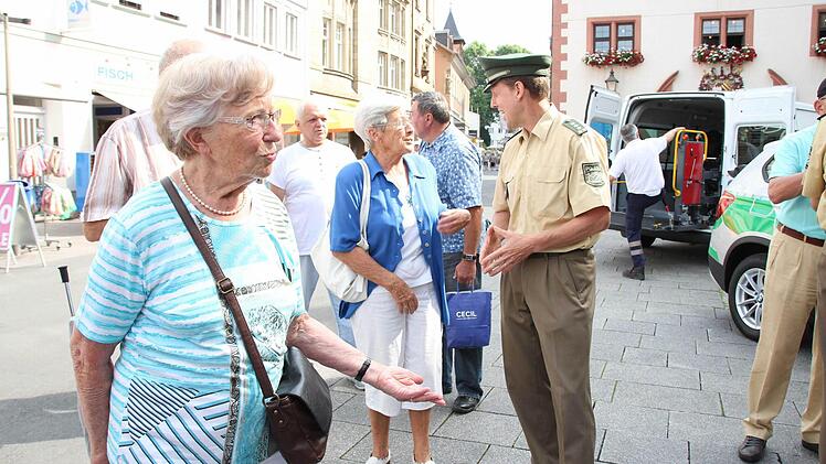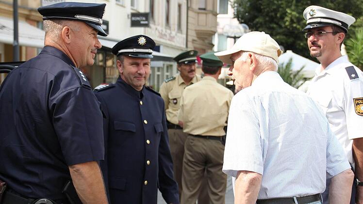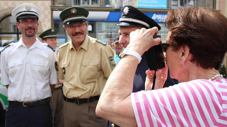 Blau oder braun-grün? Das war die Frage gestern Vormittag auf dem Bad Kissinger Marktplatz. Drei Polizisten führten eine neue Uniform vor, die vielleicht schon bald die Polizeibeamten in ganz Bayern als Dienstkleidung tragen könnten. Die Passanten hatten verschiedene Meinungen. Sie diskutierten über den hellen Streifen am Bein, die Form der Mütze, den Kragen der Präsentationsjacke und vor allem: über die Farbe - Blau.