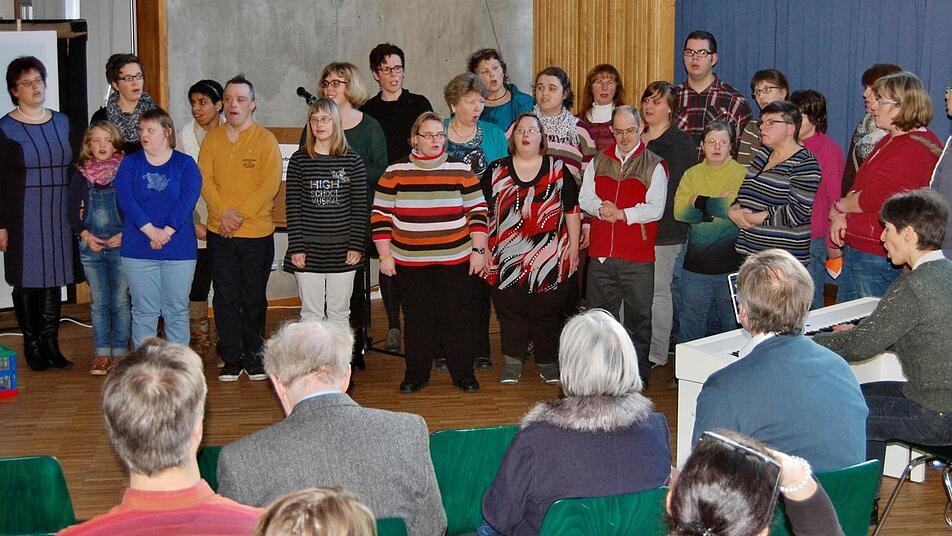 Freudige Spannung war unter den Sängerinnen und Sängern verschiedenen Alters zu spüren, bis sie unter Leitung von Christine Stumpf ihre Angehörigen, Sponsoren und Ehrengäste mit einem fröhlichen "Glück zu" in der Aula der Franz-von-Prümmer-Schule begrüßen durften. Erst im November war der Chor aus Behinderten und Nichtbehinderten im Rahmen der Offenen Behindertenarbeit gegründet worden. "Aus einfachen Liedern mit einfachen Melodien" besteht das Repertoire, erläuterte Sozialarbeiterin Mechthild Jordan das Konzept. Zur altbekannten Lummerland-Melodie wurde später zur Freude aller Zuhörer das von Christine Stumpf und Claudia Nieland getextete Kissingen-Lied uraufgeführt.